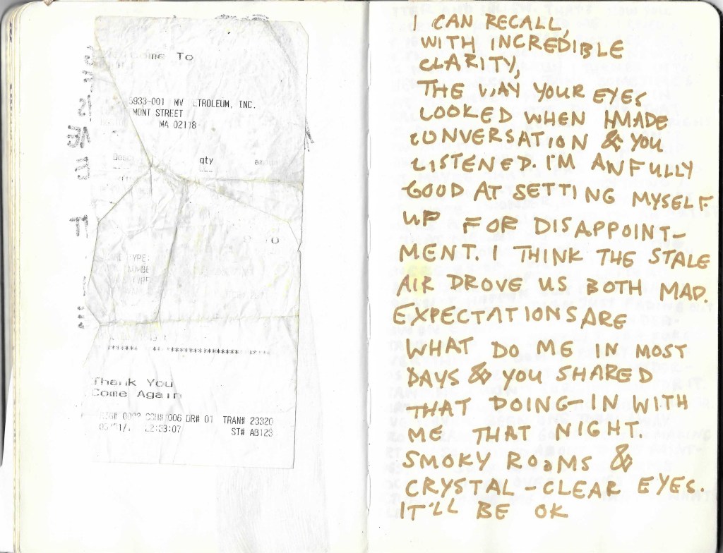 i mostly wish i could remember what the hell i was ever talking about. one journal entry that is simply too vulnerable to put here or anywhere unlocked some secret memory cave i had very carefully and intentionally buried. i inquired to my art genius friend ariel who was there & he helped remind me of some of the context for a trip to new hampshire, people i didn’t know, drugs i didn’t take, etc.